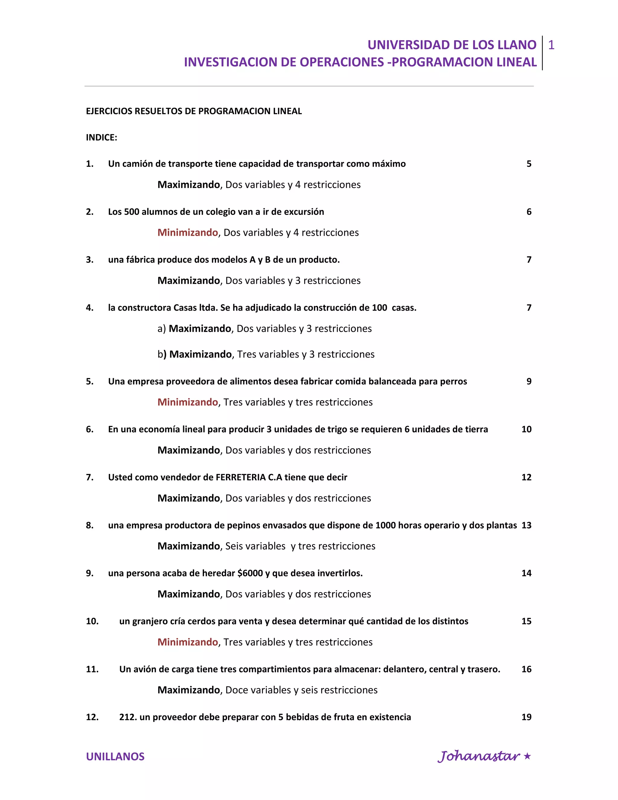 El documento presenta 44 ejercicios resueltos de programación lineal, incluyendo problemas de maximización y minimización con diferentes números de variables y restricciones. Los ejercicios cubren temas como transporte, producción, asignación de recursos y toma de decisiones económicas.