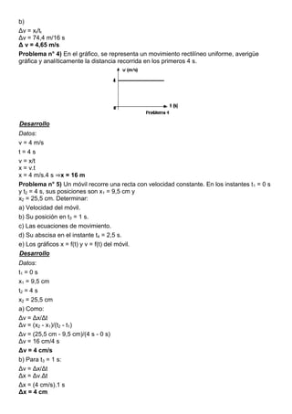 Este documento presenta 7 problemas resueltos sobre cinemática de movimiento rectilíneo uniforme. Los problemas involucran calcular velocidades a partir de distancias y tiempos dados, determinar desplazamientos totales, velocidades medias, posiciones en diferentes instantes de tiempo, y trazar gráficas de posición y velocidad. Adicionalmente, incluye 3 preguntas sobre conceptos de velocidad, pendiente de gráficas, y relación entre pendiente y tangente trigonométrica.