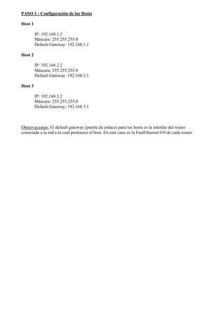 Este documento describe cómo configurar el protocolo de enrutamiento RIP en Packet Tracer para enrutar tráfico entre tres redes. Explica los pasos para configurar los hosts, los routers y RIP. Finalmente, muestra cómo verificar la conectividad entre dispositivos y que las rutas RIP funcionan correctamente mediante comandos como show ip route y ping.