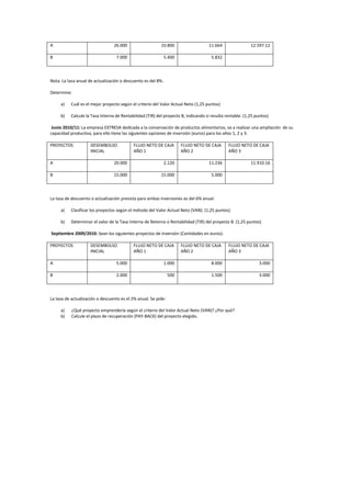 El documento presenta varios ejercicios de evaluación de inversión, donde se analizan diferentes proyectos evaluando su rentabilidad mediante criterios como el Valor Actual Neto (VAN) y la Tasa Interna de Rentabilidad (TIR). A lo largo de diferentes años académicos, se plantean casos de inversión para restaurantes y otras empresas, con cálculos de flujos de caja esperados y tasas de descuento aplicadas. Se requiere tomar decisiones sobre qué proyecto de inversión es más recomendable según diferentes metodologías financieras.