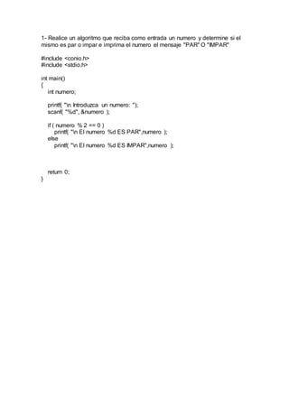 El documento presenta dos ejercicios de programación en C. El primer ejercicio crea un algoritmo que recibe un número como entrada y determina si es par o impar, imprimiendo un mensaje. El segundo ejercicio crea un algoritmo que calcula el aumento salarial de acuerdo al tiempo de servicio en una universidad, aplicando diferentes porcentajes de aumento según el rango de años trabajados.
