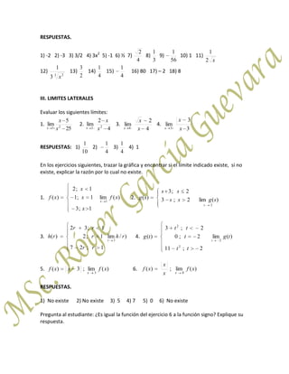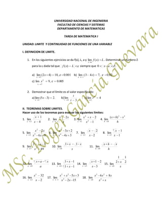 Este documento presenta varios ejercicios y teoremas relacionados con los límites y la continuidad de funciones de una variable. En la primera sección, se piden determinar límites y demostrar que cumplen con valores especificados. La segunda sección cubre teoremas de límites que se usan para evaluar varios límites. La tercera sección analiza límites laterales. La cuarta sección calcula límites al infinito y límites infinitos. Las secciones restantes cubren continuidad, propiedades de funciones continuas, tip