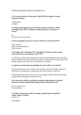 El documento contiene una serie de ejercicios sobre redes informáticas. Los ejercicios cubren temas como ARPANET, tipos de redes (LAN, MAN, WAN), protocolos TCP/IP, direcciones IP, máscaras de red, topologías de red, WiFi, fibra óptica y velocidad de conexión a Internet. El objetivo es que los estudiantes investiguen y aprendan conceptos básicos sobre redes de computadoras.