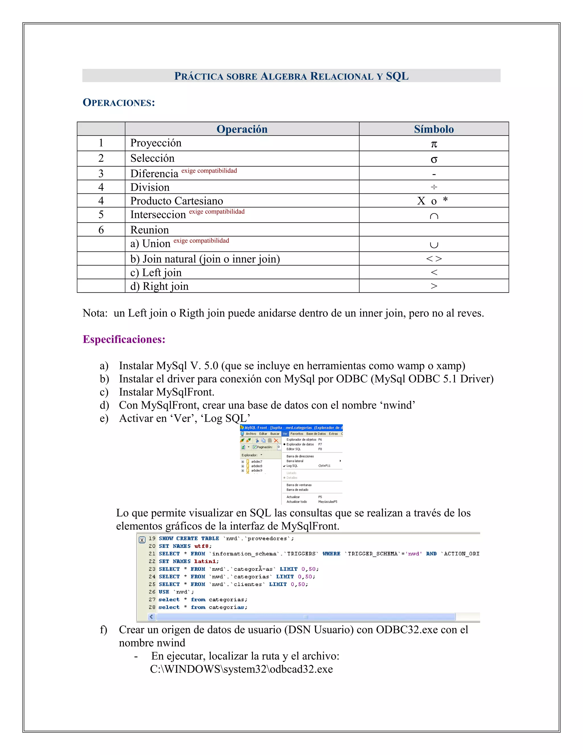 Este documento presenta las principales operaciones de álgebra relacional y SQL como proyección, selección, diferencia, división, producto cartesiano e intersección. Además, incluye especificaciones para instalar MySQL y crear una base de datos de ejemplo para realizar consultas sobre relaciones y tablas. Finalmente, proporciona varios ejemplos de consultas SQL sobre dicha base de datos con sus equivalentes en álgebra relacional.