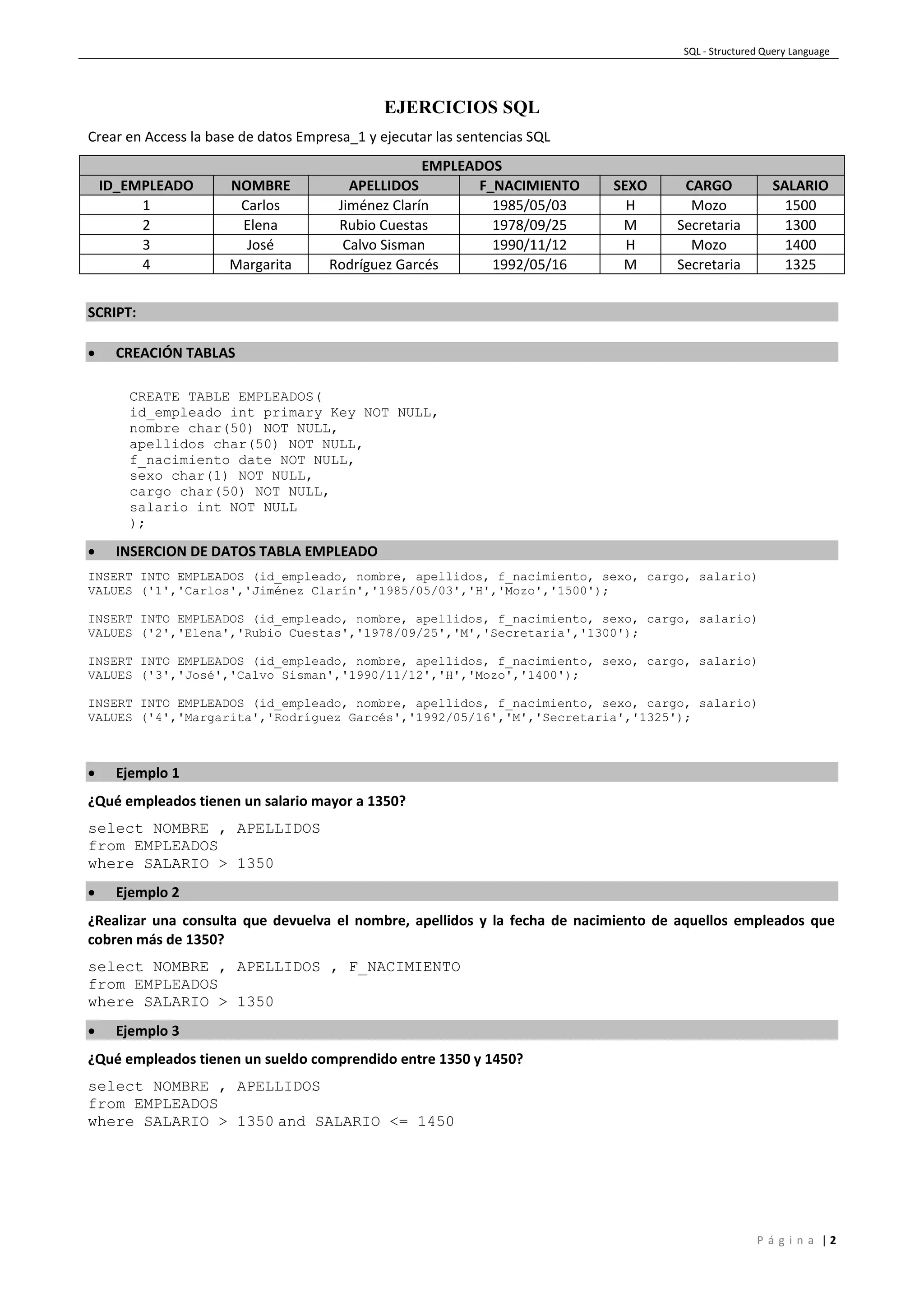 El documento presenta 32 ejemplos de sentencias SQL para manipular y consultar datos de las tablas "EMPLEADOS" y "DEPARTAMENTOS" de una base de datos. Las sentencias incluyen creación de tablas, inserción de datos, consultas simples y complejas, actualización y eliminación de registros.