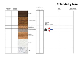El documento habla sobre la polaridad y fase en las señales sísmicas. Explica cómo diferentes materiales como lutita, arena y caliza producen señales sísmicas con polaridad normal o inversa dependiendo de su densidad y velocidad sísmica. También presenta una clasificación de las clases AVO según el intercepto y gradiente en función del ángulo de incidencia de la onda sísmica.