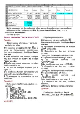El documento presenta varios ejercicios sobre el uso de funciones en Excel. El primer ejercicio instruye al usuario a crear un modelo para registrar datos de precipitaciones guardándolo en una carpeta. El segundo ejercicio pide crear un modelo para registrar las ventas de vendedores por mes guardándolo también en una carpeta. Finalmente, varios ejercicios de evaluación prueban el conocimiento del usuario sobre el uso correcto de funciones en Excel.