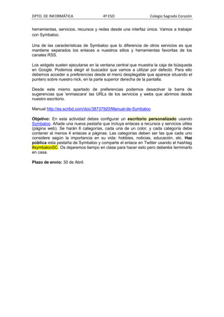 Este documento describe 4 actividades prácticas relacionadas con las redes sociales y Twitter para un curso de informática. La primera actividad implica crear una cuenta de Twitter. La segunda y tercera actividad piden a los estudiantes que escriban microrrelatos o suban fotos a hashtags específicos. La cuarta actividad implica configurar un escritorio virtual personalizado usando la herramienta Symbaloo y compartir el enlace en Twitter. Todas las actividades deben completarse para el 30 de abril.