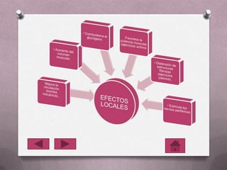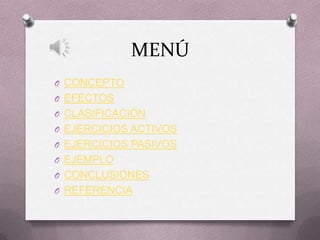 Este documento describe los ejercicios terapéuticos, los cuales se utilizan movimientos corporales con fines de tratamiento médico. Existen dos tipos principales de ejercicios: activos, realizados voluntariamente por el paciente, y pasivos, aplicados al paciente sin su participación. Los ejercicios terapéuticos buscan restaurar funciones físicas luego de lesiones y prevenir deformidades a través del fortalecimiento muscular y estimulación de sistemas corporales.