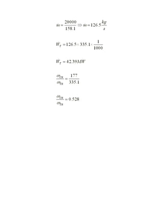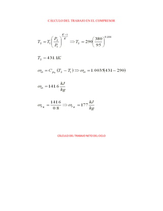 Este documento presenta los detalles de una planta de turbina de gas que opera en un ciclo Brayton con regeneración. Se proporcionan los datos de temperatura, presión, eficiencias del regenerador, compresor y turbina. Se piden calcular la potencia de la turbina y la fracción de potencia usada para mover el compresor. Luego, se cambian algunos datos y se repiten los cálculos. Finalmente, se concluye que los resultados varían según los datos de temperatura, presión y eficiencias.