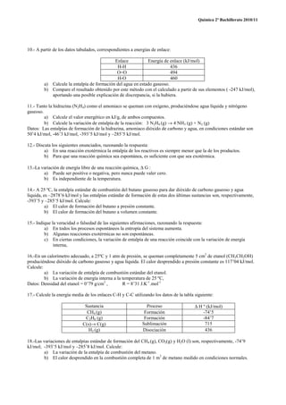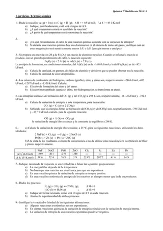 Este documento presenta 24 problemas de termoquímica relacionados con conceptos como entalpía, energía libre, calor de reacción, espontaneidad y equilibrio químico. Los problemas incluyen cálculos de variaciones de entalpía, energía y entropía para diversas reacciones químicas utilizando datos termoquímicos tabulados.