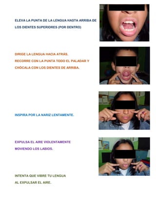 El documento describe el rotacismo, una dificultad para pronunciar el fonema /r/, que es común en niños menores de 5 años pero que generalmente se corrige alrededor de los 6 años. Luego proporciona una serie de ejercicios motores orales para ayudar a los niños a pronunciar correctamente la /r/, como imitar el sonido de una motocicleta, chocar la lengua contra los dientes superiores y articular sílabas como "ra" y "re".