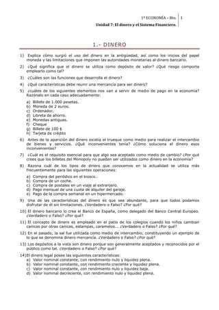 Este documento presenta una serie de preguntas sobre conceptos clave relacionados con el dinero y el sistema financiero, incluyendo el origen del dinero, sus funciones, características del dinero legal, tipos de depósitos bancarios, intermediarios financieros como bancos y otras entidades, y conceptos como la oferta monetaria. El objetivo es evaluar el conocimiento del estudiante sobre estos temas fundamentales de economía.