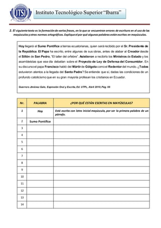 Este documento presenta un taller para desarrollar en casa sobre el uso de las mayúsculas. Incluye 10 oraciones con errores ortográficos que deben corregirse, un texto con mayúsculas y minúsculas usadas incorrectamente que debe explicarse, instrucciones para escribir oraciones usando abreviaturas y corregir errores en un párrafo, y una tabla con reglas ortográficas sobre mayúsculas y oraciones de ejemplo. El objetivo es reforzar conocimientos sobre el uso correcto de mayúsculas.