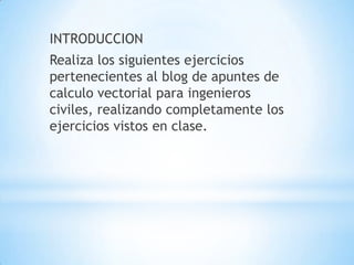 Este documento presenta la resolución de varios ejercicios de cálculo vectorial para ingenieros civiles. Incluye hallar ecuaciones de rectas en forma vectorial, paramétrica y continua dados puntos y vectores, hallar una recta perpendicular a dos vectores dados y hallar la ecuación de un plano dado un punto y dos vectores. El autor deja pendiente uno de los ejercicios y agradece al ingeniero revisar el tema.