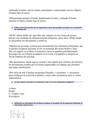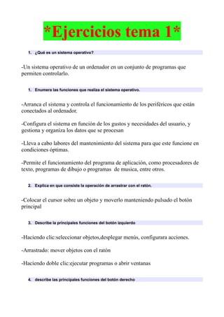 El documento habla sobre los sistemas operativos y sus funciones. Explica que un sistema operativo controla y gestiona un ordenador, permitiendo ejecutar programas de aplicación. Enumera algunas de sus funciones como arrancar el sistema, gestionar periféricos, configurar el sistema según el usuario, y mantener el sistema en buen estado. También describe operaciones básicas del ratón y funciones de los botones izquierdo y derecho.