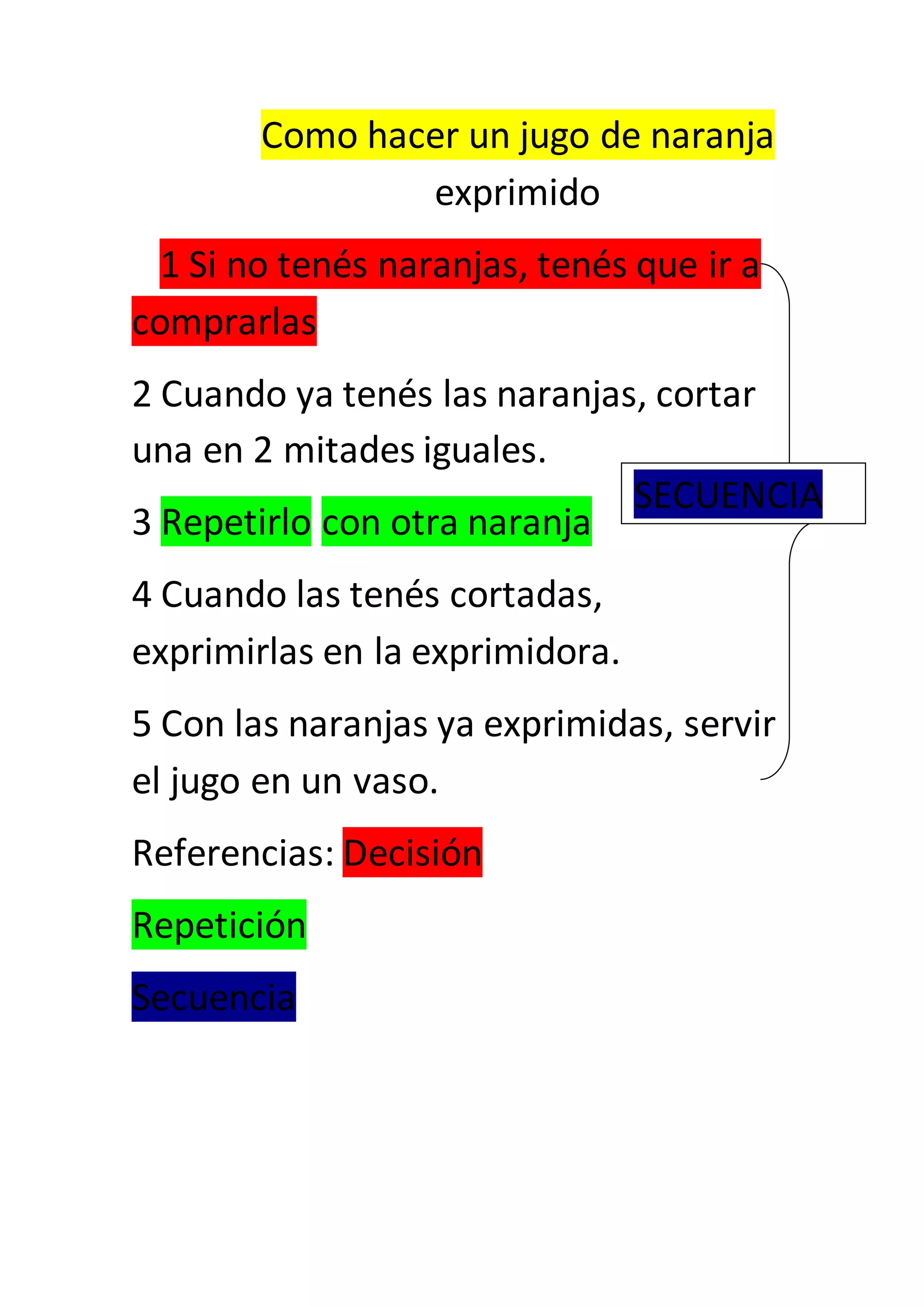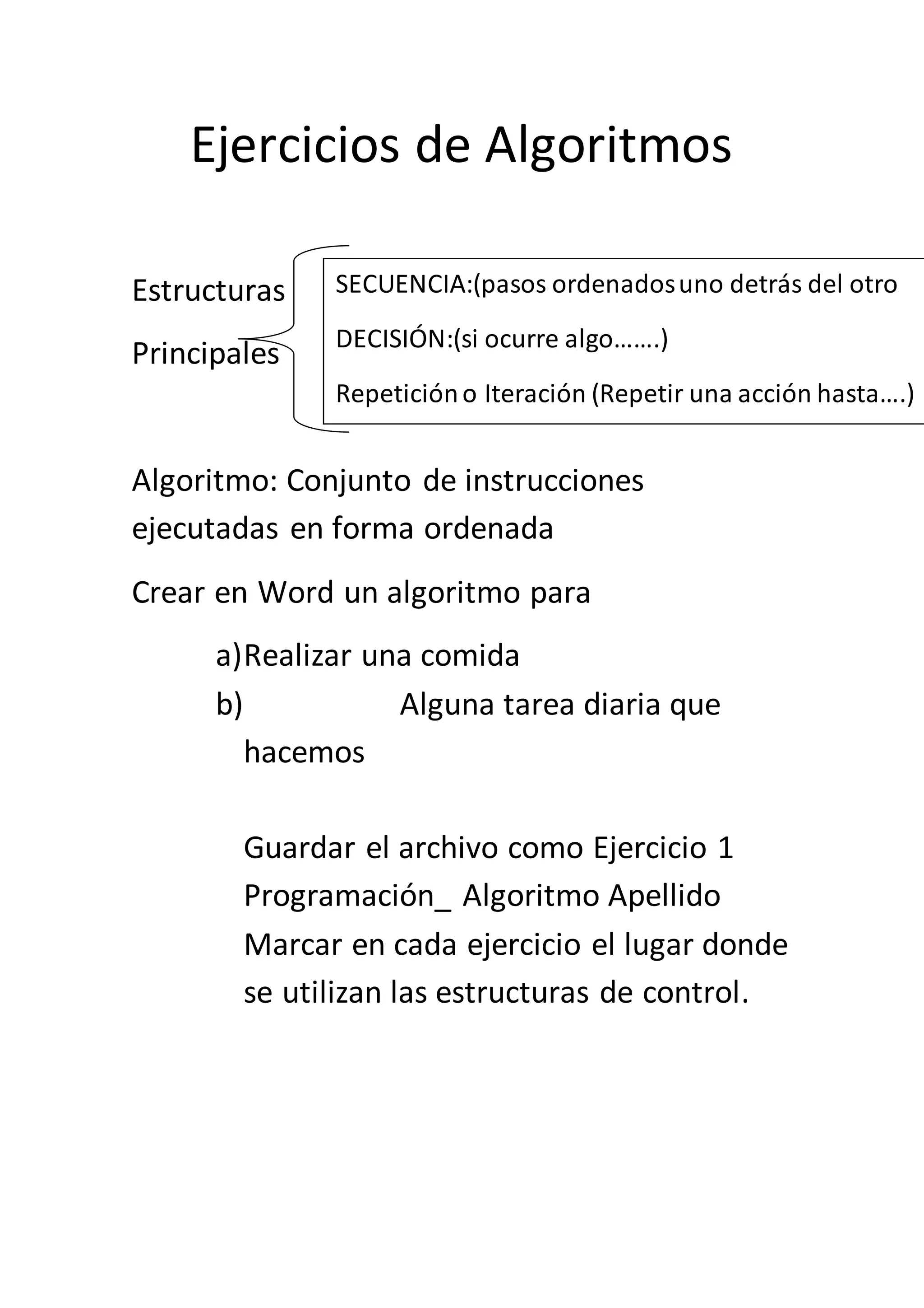 El documento describe los conceptos básicos de algoritmos y estructuras de control. Indica que se deben crear algoritmos en Word para realizar una comida y una tarea diaria, marcando las estructuras de control utilizadas. Luego presenta dos ejemplos de algoritmos, uno para hacer jugo de naranja y otro para ir al baño, identificando las estructuras de secuencia, decisión y repetición en cada uno.
