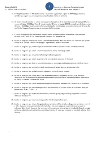 Este documento contiene 29 problemas o ejercicios de programación en Java relacionados con temas como manejo de arreglos, excepciones, funciones, cálculo de áreas, sueldos, descuentos, números primos, secuencias de Fibonacci, ordenamiento de números y más. El objetivo es que el estudiante desarrolle algoritmos y programas en Java para resolver cada uno de los problemas planteados.