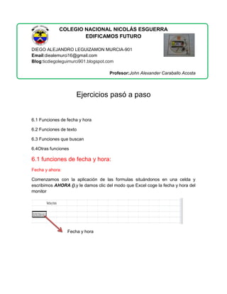 Este documento presenta ejemplos del uso de funciones en Excel como FECHA(), AHORA(), DIAS360(), CONCATENAR(), BUSCAR(), PRODUCTO(), PROMEDIO() y MEDIANA(). Incluye ejemplos de cálculo de edad, concatenación de cadenas de texto, búsqueda de números telefónicos y estadísticas básicas como promedio y mediana de conjuntos de datos.