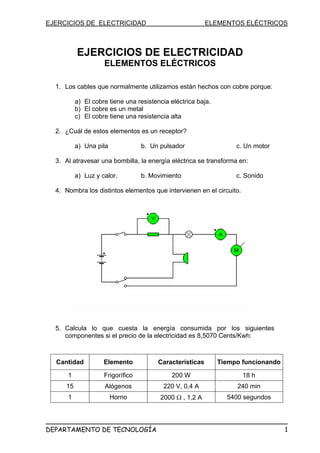 Este documento presenta una serie de ejercicios sobre conceptos básicos de electricidad como elementos eléctricos, circuitos, resistencias equivalentes e instrumentos de medida. Los ejercicios incluyen cálculos para determinar magnitudes eléctricas como intensidad de corriente, resistencia, tensión y potencia en diferentes circuitos. El documento proporciona información para que los estudiantes practiquen y apliquen sus conocimientos sobre conceptos fundamentales de electricidad.