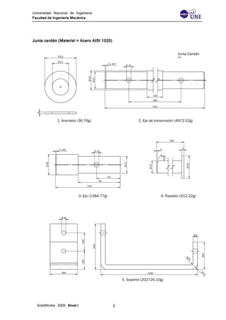 El documento presenta el plan de estudios del curso SolidWorks 2009 Nivel I de la Universidad Nacional de Ingeniería, el cual consta de 32 lecciones con ejercicios de modelado de piezas y ensambles utilizando diferentes materiales como cobre, acero y aleaciones.