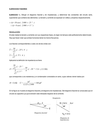 1) El documento presenta 7 ejercicios sobre circuitos eléctricos resueltos usando diagramas fasoriales. 2) Los ejercicios involucran determinar parámetros de circuitos como resistencias, capacitancias e inductancias a partir de valores de tensión y corriente. 3) También se usa el método de los tres voltímetros y el método de los tres amperímetros para medir parámetros desconocidos.