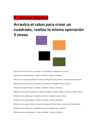 Este documento proporciona instrucciones paso a paso para alinear y distribuir objetos en CorelDraw X5. Explica cómo alinear cuadrados a la izquierda, derecha, arriba y abajo usando el menú Organizar. También muestra cómo distribuir uniformemente un círculo, cuadrado y rectángulo seleccionando la opción Espaciado en el menú Distribuir.