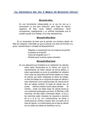 Microsoft Office es una herramienta indispensable que incluye Word para redacción, Excel para hojas de cálculo y representación de datos, y otras herramientas para actividades de trabajo y estudio. Word permite escritura rápida y formato flexible, mientras que Excel permite cálculos, bases de datos y representación gráfica de datos en hojas de cálculo.