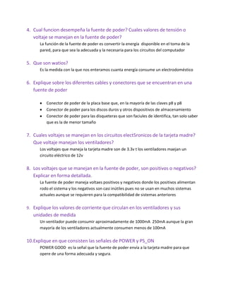 La fuente de poder convierte la energía de la red eléctrica a los voltajes necesarios para que funcionen los componentes electrónicos del computador, como 3.3V y 12V. Presenta conectores para la placa base, discos duros y otros dispositivos. Maneja voltajes positivos y negativos, donde los positivos alimentan el sistema y los negativos son menos usados actualmente. Problemas comunes en fuentes de mala calidad incluyen fallas en el inicio del sistema, sobrecalentamiento y errores de memoria.