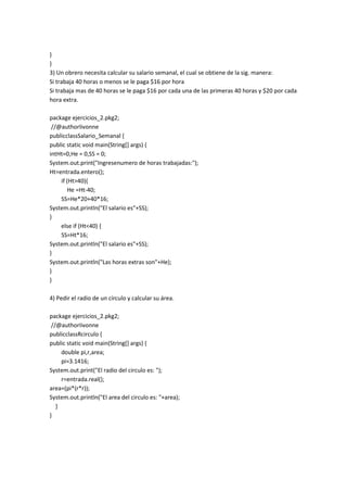 El documento presenta 12 ejercicios de programación con condicionales en Java. Cada ejercicio describe un problema diferente que involucra determinar el resultado de una operación u obtener un valor en base a ciertas condiciones sobre las variables de entrada. Los ejercicios cubren temas como promedios, descuentos, salarios, cálculo de áreas, ordenamiento de números y pulsaciones cardíacas.