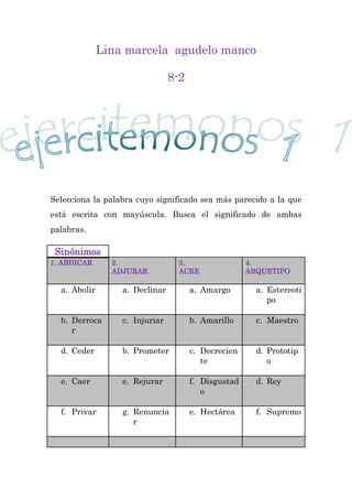 Este documento presenta 12 pares de palabras en las que se pide identificar el sinónimo o antónimo de cada una. Se explica brevemente el significado de las palabras y su sinónimo u opuesto correspondiente.