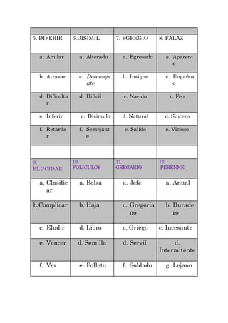 5. DIFERIR 6.DISÍMIL 7. EGREGIO 8. FALAZ