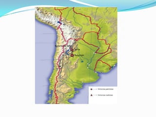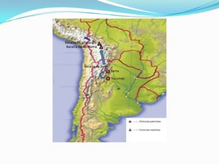 La primera campaña al Alto Perú entre 1810 y 1811 tuvo éxito inicial pero terminó en derrota. La segunda campaña entre 1812 y 1813 involucró victorias patriotas en Tucumán y Salta pero derrotas posteriores. José de San Martín asumió el mando en 1814 y planeó una nueva estrategia de invadir Perú por mar luego de liberar Chile, antes de renunciar para organizar el Ejército de los Andes en Cuyo.