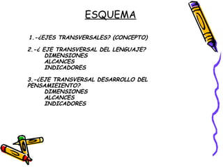 El documento describe los seis ejes transversales de la educación básica en Venezuela: lenguaje, desarrollo del pensamiento, valores, trabajo y ambiente. Para cada eje, se definen sus dimensiones, alcances e indicadores. Los ejes transversales buscan integrar las diferentes áreas del conocimiento y garantizar que los estudiantes desarrollen habilidades en comunicación, pensamiento crítico, valores y trabajo a través del currículo escolar.