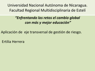 El documento describe la aplicación del eje transversal de gestión de riesgo en la educación en Nicaragua. Explica que la gestión de riesgo debe integrarse vertical y horizontalmente en el currículo para formar personas con autonomía y compromiso social. También resume dos experiencias de implementar la gestión de riesgo como eje transversal en institutos secundarios y en la carrera de Ciencias Ambientales de la Universidad Nacional Autónoma de Nicaragua.