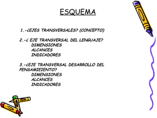 El documento presenta un esquema sobre los ejes transversales de la educación básica, incluyendo conceptos, dimensiones, alcances e indicadores de cinco ejes: lenguaje, desarrollo del pensamiento, valores, trabajo y ambiente. Los ejes transversales buscan integrar diferentes áreas del conocimiento y contextos para ofrecer una educación significativa que promueva el desarrollo integral del estudiante. Se explica brevemente cada eje y sus componentes para orientar la práctica pedagógica.