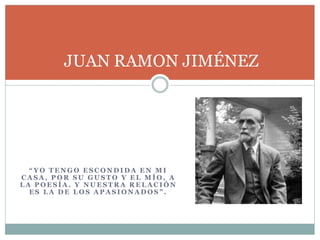 Este documento presenta un resumen biográfico de Juan Ramón Jiménez, poeta español. Nació en 1881 en Moguer y desarrolló su carrera literaria en Madrid, donde conoció a otros intelectuales de la época. Dividió su obra poética en tres etapas que reflejan su evolución estilística. Fue reconocido internacionalmente pero debió exiliarse durante la guerra civil. Recibió el Premio Nobel de Literatura en 1956.