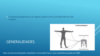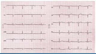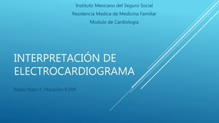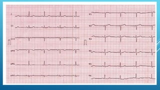 El documento proporciona una guía para la interpretación sistemática de un electrocardiograma. Explica conceptos básicos como la frecuencia cardíaca, el ritmo, el eje y las ondas P, QRS, ST y T. Describe cómo medir cada parámetro e identificar posibles hallazgos anormales. Además, detalla las derivaciones utilizadas para registrar la actividad eléctrica del corazón y su significado.