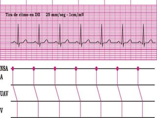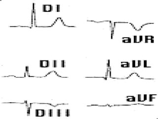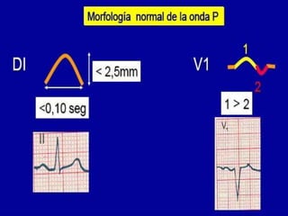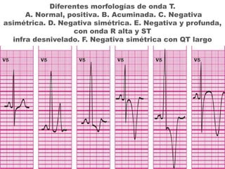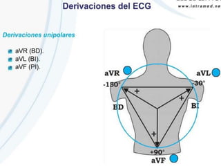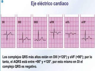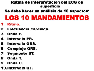 Este documento proporciona información sobre el electrocardiograma (ECG). Explica que el ECG registra los potenciales eléctricos del corazón obtenidos desde la superficie corporal mediante electrodos. Describe los pasos para realizar un ECG, incluyendo la colocación de electrodos y la toma de derivaciones. También define conceptos clave como ondas, segmentos e intervalos y explica cómo analizar un ECG de manera sistemática.