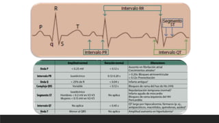 Este documento proporciona una introducción al electrocardiograma (ECG), describiendo su importancia para interpretar el ritmo cardíaco y evaluar anomalías cardíacas. Explica las 12 derivaciones del ECG, incluyendo 6 en el plano frontal y 6 derivaciones precordiales en el plano horizontal. También define los segmentos e intervalos clave del ECG, como el segmento PR, segmento ST, intervalo PR e intervalo QT.
