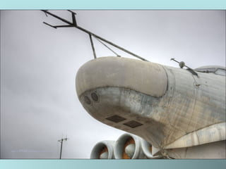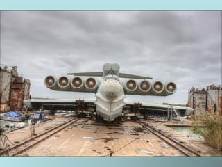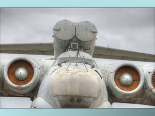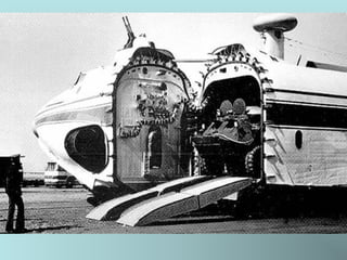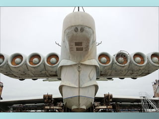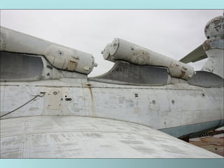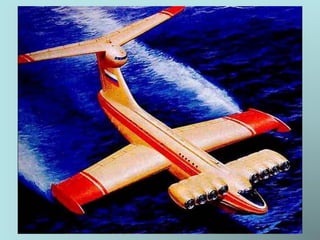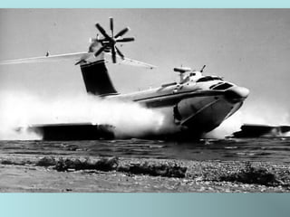 Un ekranoplano es un vehículo que aprovecha el efecto suelo para volar a pocos metros sobre el agua o la nieve. Fueron desarrollados en la Unión Soviética y tienen alas cuadradas que forman un colchón de aire para proporcionar sustentación a baja altitud. Aunque los proyectos fueron abandonados, Rusia ahora está reanudando el desarrollo de nuevos ekranoplanos civiles y militares.