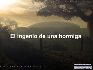 El documento describe la historia de una hormiga que logra cruzar una grieta profunda llevando una carga pesada al usar la carga como un puente. Luego explica que los problemas y cargas en la vida a menudo pueden convertirse en oportunidades para el éxito si las enfrentamos con valor y confianza en lugar de quejarnos. Finalmente anima al lector a tener fe en Dios cuando enfrente adversidades.