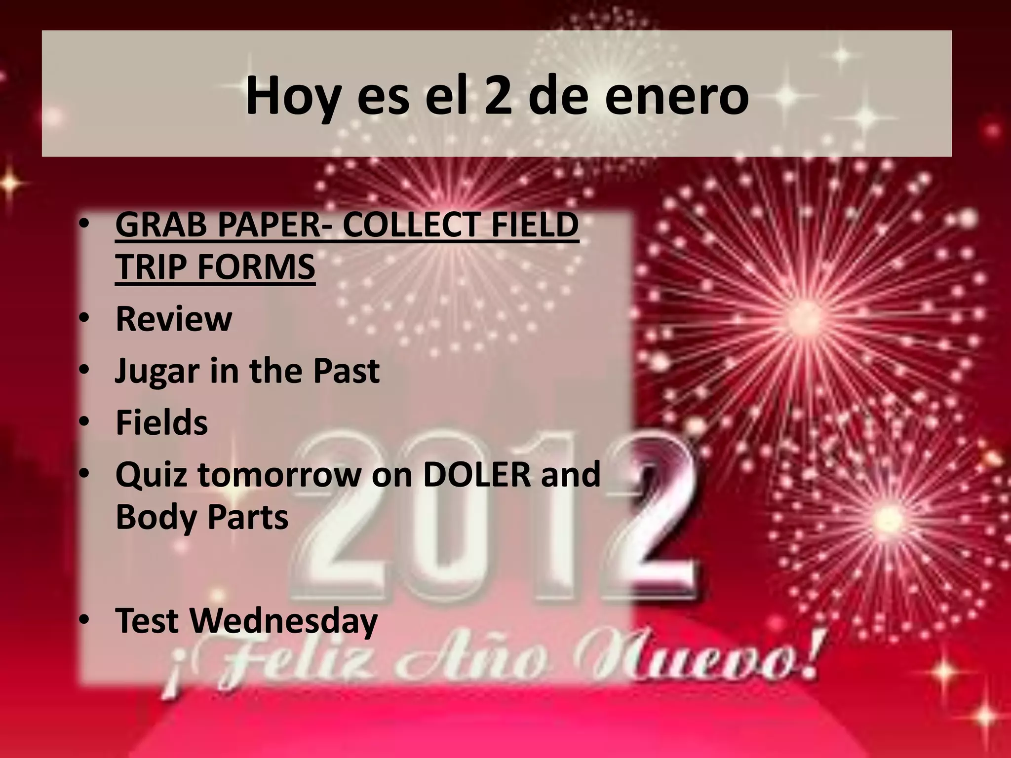 El documento resume las actividades del día 2 de enero. Incluye instrucciones para recoger formularios de viajes escolares, repasar conjugaciones de verbos en el pasado como patinar y comer, y prepararse para un examen sobre partes del cuerpo y el verbo doler. También proporciona una lista de partes del cuerpo en español y su traducción al inglés, y asigna tareas relacionadas con los temas cubiertos.
