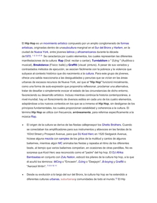El hip hop surgió en la década de 1970 en el Bronx, Nueva York, como una forma de expresión artística entre la juventud afroamericana y latina. Se caracteriza por cuatro elementos: rap, turntablism, breakdance y graffiti. Ofreció una salida a las desigualdades sociales que enfrentaban estos jóvenes. Aunque se originó en comunidades marginadas, el hip hop se ha extendido a nivel mundial y continúa evolucionando, manteniendo sus principios fundamentales.