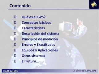 El documento 'El ABC del GPS' de Alexander R. González describe el Sistema de Posicionamiento Global (GPS), su funcionamiento, características, segmentos y aplicaciones en navegación y geodesia. Explica los principios de medición, errores asociados y técnicas como el GPS diferencial. Además, aborda el futuro del GPS y su evolución rápida, así como comparativas con otros sistemas de navegación.