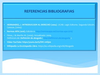El documento proporciona una definición de abogado como la persona que ejerce la defensa jurídica en juicios y procesos administrativos, además de ofrecer asesoramiento legal. Incluye recursos adicionales como un video y referencias a fuentes relevantes, como Wikipedia y definiciones en línea. Está creado por José Luis Romero y es licenciado bajo Creative Commons.