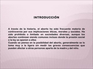 El documento trata sobre el tema del aborto, discutiendo sus definiciones, causas, consecuencias físicas y psicológicas. Explica que el aborto ha sido históricamente controvertido por sus implicaciones éticas y legales. También analiza los diferentes tipos de aborto como espontáneo, inducido, terapéutico y eugenésico, así como las posiciones legales sobre el aborto en diferentes países y contextos.