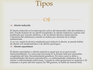 Este documento describe los dos tipos principales de aborto: el aborto inducido, que es la interrupción activa del embarazo ya sea por razones médicas o por decisión de la mujer embarazada, y el aborto espontáneo o natural, que ocurre sin ser provocado e involucra frecuentemente anomalías genéticas del feto o problemas de salud de la madre.