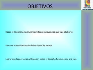 Este documento proporciona información sobre el aborto, incluyendo definiciones, tipos (químico y quirúrgico) y procedimientos. Explica que el aborto es la interrupción del embarazo y causa la muerte del feto. Describe los métodos químicos y quirúrgicos, como la aspiración y el legrado, y sus usos dependiendo del tiempo de gestación. El objetivo es generar reflexión sobre las consecuencias del aborto y el derecho fundamental a la vida.