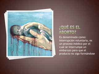 El documento describe diferentes tipos de aborto, incluyendo aborto espontáneo, aborto provocado, aborto inseguro y aborto consumado. Explica que el aborto provocado es una interrupción deliberada del embarazo por razones médicas y que existen diferentes métodos como aspiración o dilatación y extracción dependiendo de las semanas de gestación. También menciona posibles riesgos como desgarros cervicales, embarazo ectópico o endometritis.